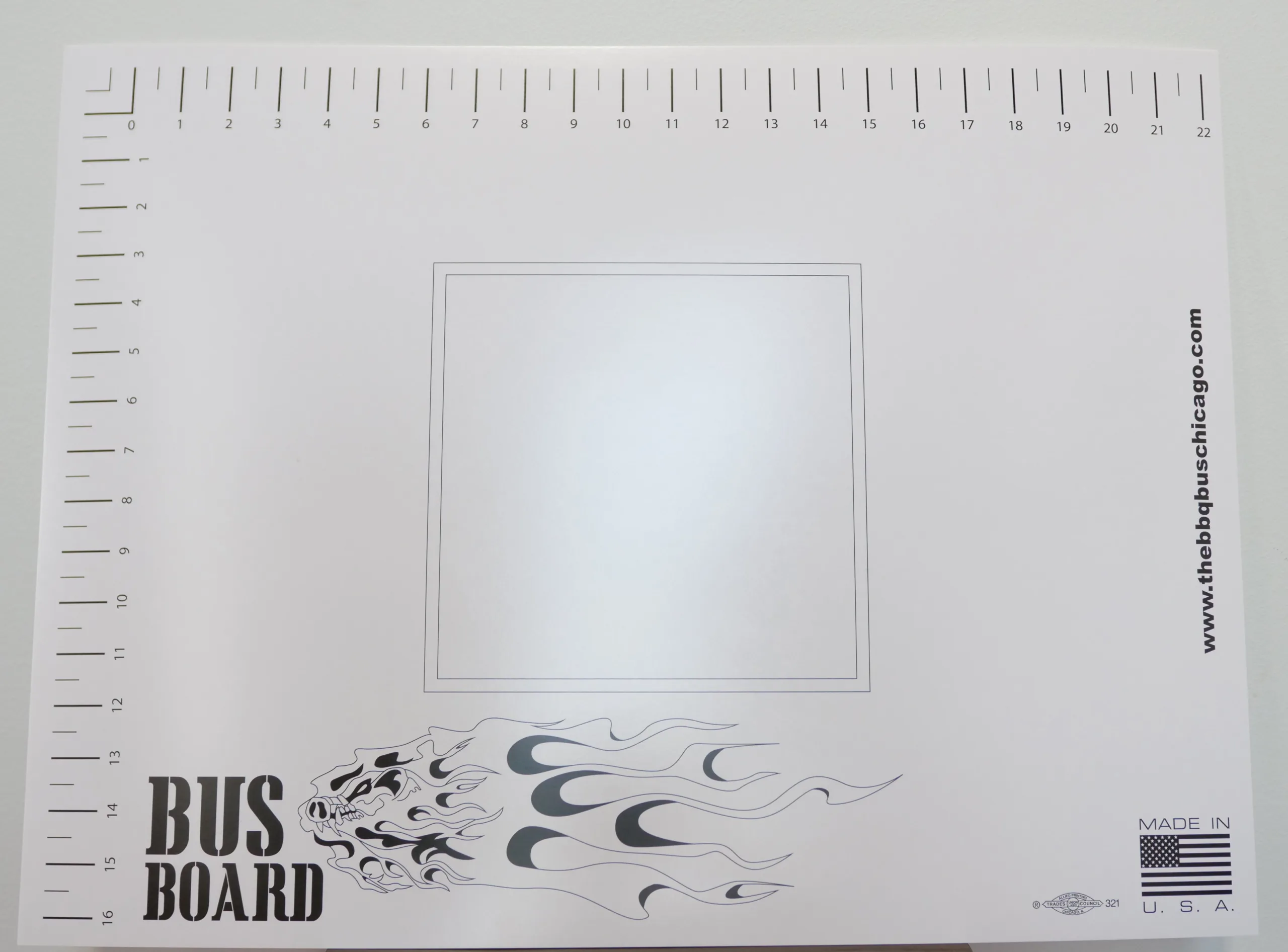 The BBQ Bus disposable cutting boards offer ruler dimensions along with a square in the middle of the board to simulate the size of a turn-in box for the competition cook.