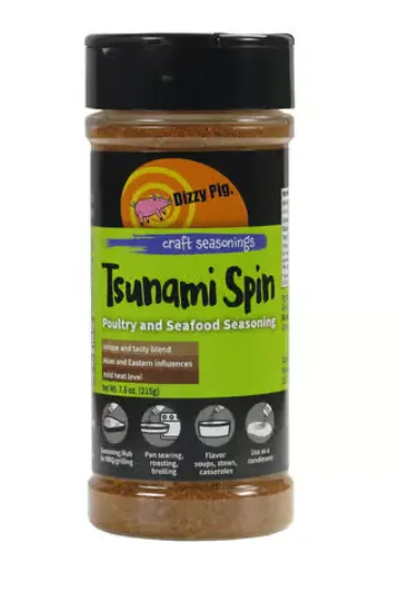But while unique, the flavor certainly isn’t strange: The Dizzy Pig team has won countless chicken awards using Tsunami Spin, including 2nd and 3rd at the Jack Daniels World Championships. With its overtones of sesame and ginger, it is the perfect seafood seasoning and poultry seasoning, especially delicious on grilled chicken and duck. It complements shiitake mushrooms beautifully, and enhances the flavor of pork, vegetables and shrimp like nobody’s business. Coat your meat with Tsunami Spin and grill it to a golden brown, this is a surefire crowd-pleaser.